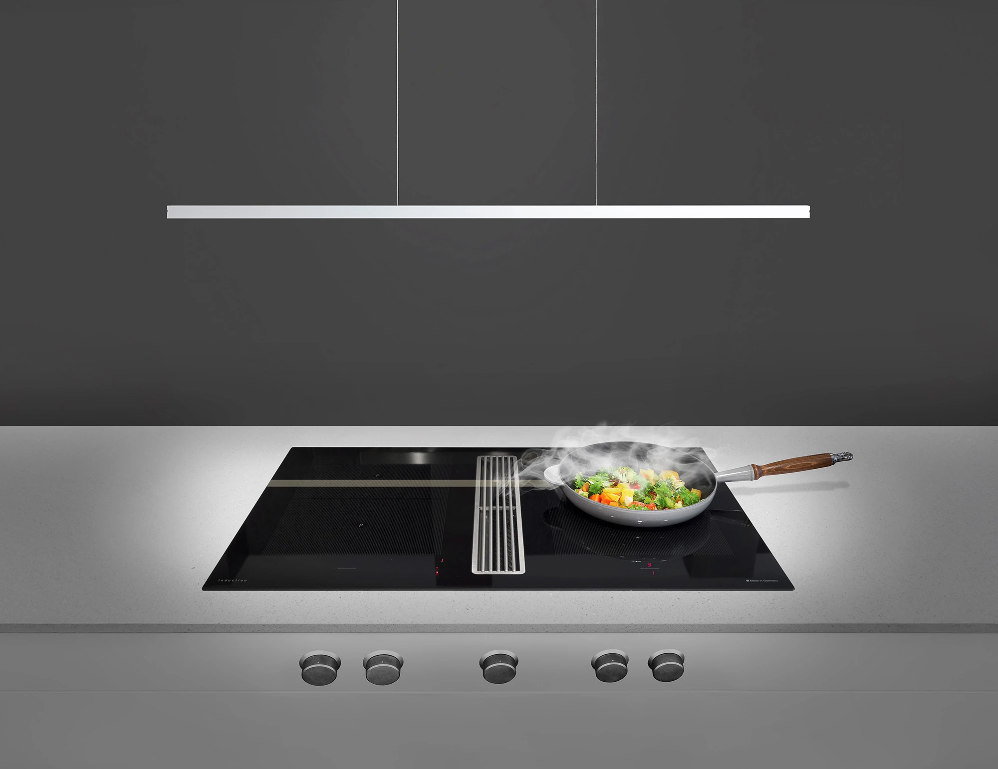Viele Wand- und Deckenlüfter haben integrierte Beleuchtungen. Bei Tischlüftern ist es sinnvoll sein, die perfekte Beleuchtung über der Kochstelle zu installieren. Mit der neuen ERGE LUCE 26 wird der vorhandene Vorteile der freien Sicht bei Tischabzügen nicht gestört. Die Kochfeldbeleuchtung verhindert Schattenbildung, entlastet die Augen und sorgt mit modernem und minimalistischem Design für eine angenehme Atmosphäre beim Kochen.